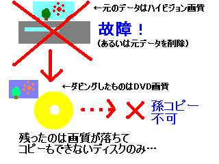 ところがこの制度には重大な欠点があります。それはダビングした外部メディア、すなわち「子」から新たにコピーすること(いわゆる孫コピー)が認められていない点です。これは、親である録画機器のデータを消失した場合、今までダビングした回数にかかわらず、それ以上ダビングする権利を完全に失われてしまうことを意味します。